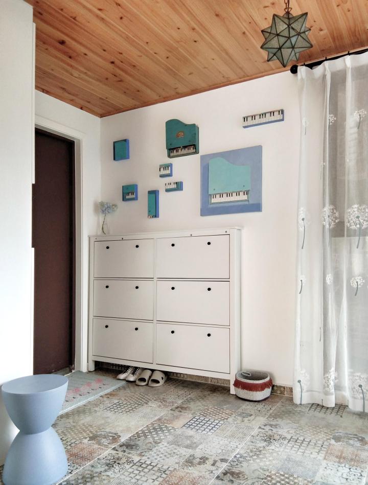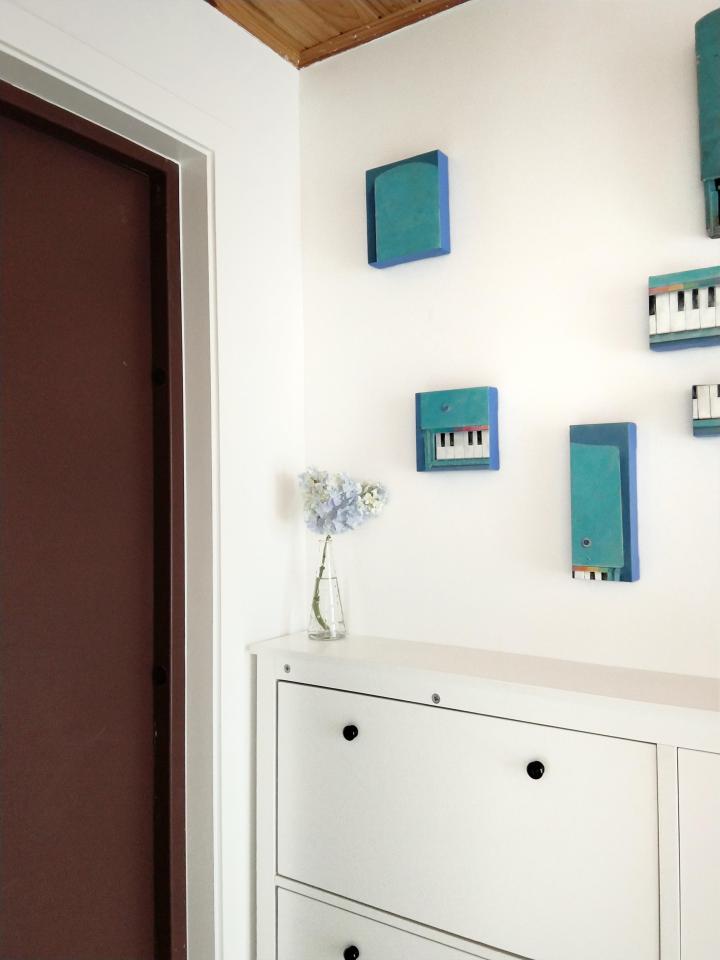 家里有个大玄关(可以看平面图),男主孙胖喜欢画画,曾经梦想着家里挂满自己的作品,结果真的实现了,玄关现在是家里的第一个作品展示区。
