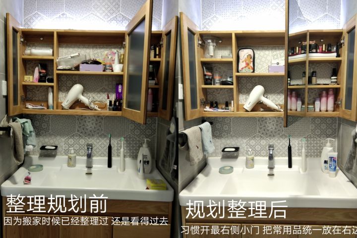 浴室柜内部的收纳:二花习惯右手开门,所以常用的水乳都在镜柜右边。