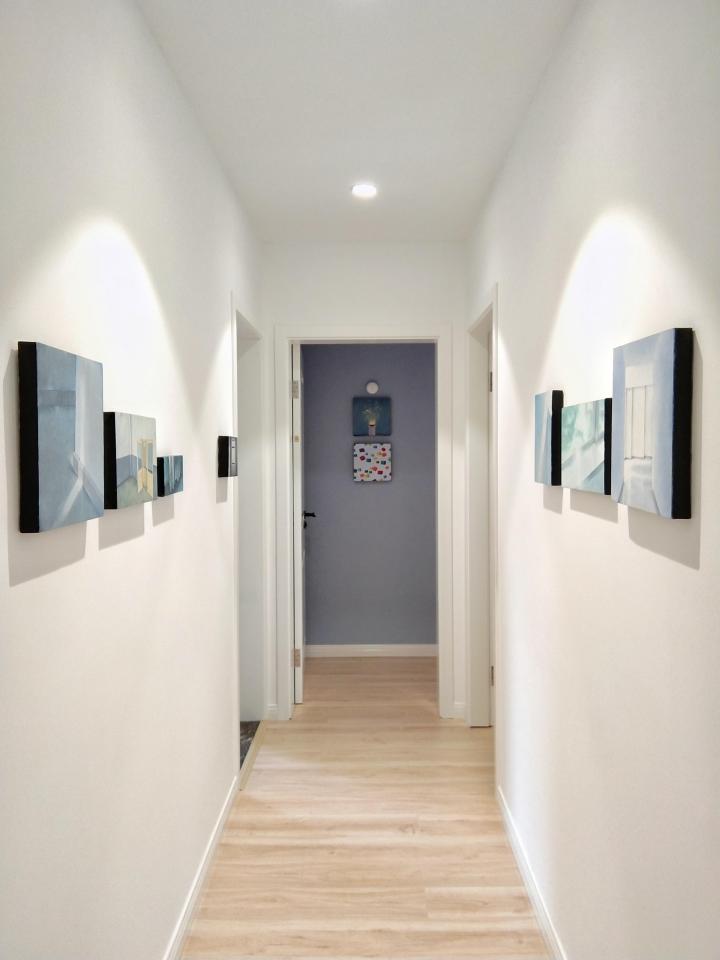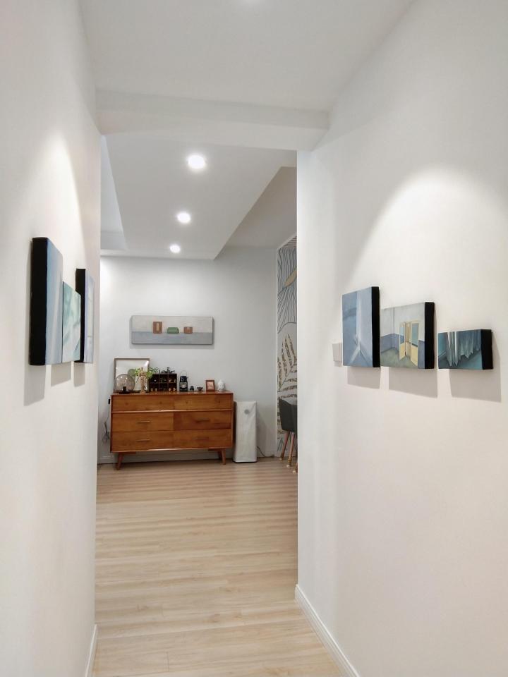 从客厅到卧室的走廊也是画廊。天花板正中央装一只射灯,对两侧都有很好的洗墙效果。尽头挂画上的白色圆灯是感应的,晚上有人会自动亮。