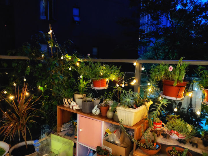 太阳能串灯环保不费电,每天晚上都会亮,不指望它照明,就是营造营造氛围。