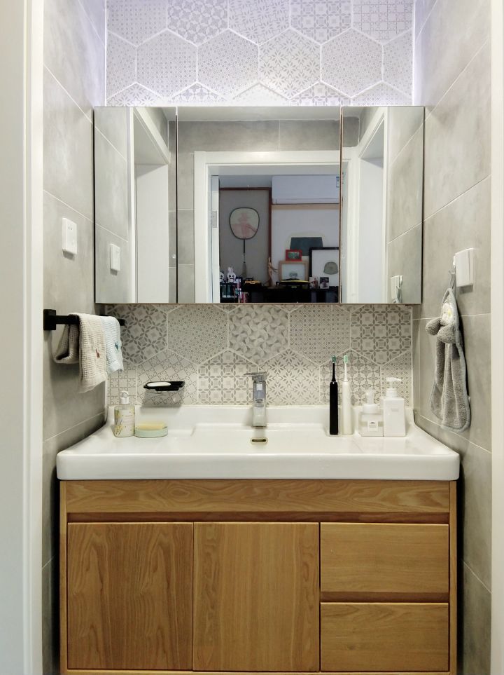 走廊其实一个门洞进去是卫生间。从实用出发,浴室柜选了上下都有储物功能的镜柜。