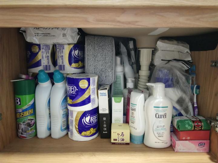 下面的柜子里放卫生纸、洗浴品、清洁剂。提醒大家千万不要囤货,没有便宜多少,买回来还要为怎么收纳费神。