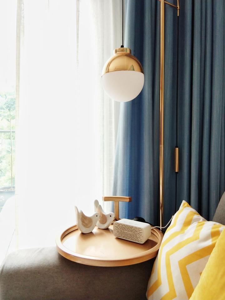边几搭着沙发扶手,很省地方;旁边的落地灯和边几配一脸,好多人以为是一体的。