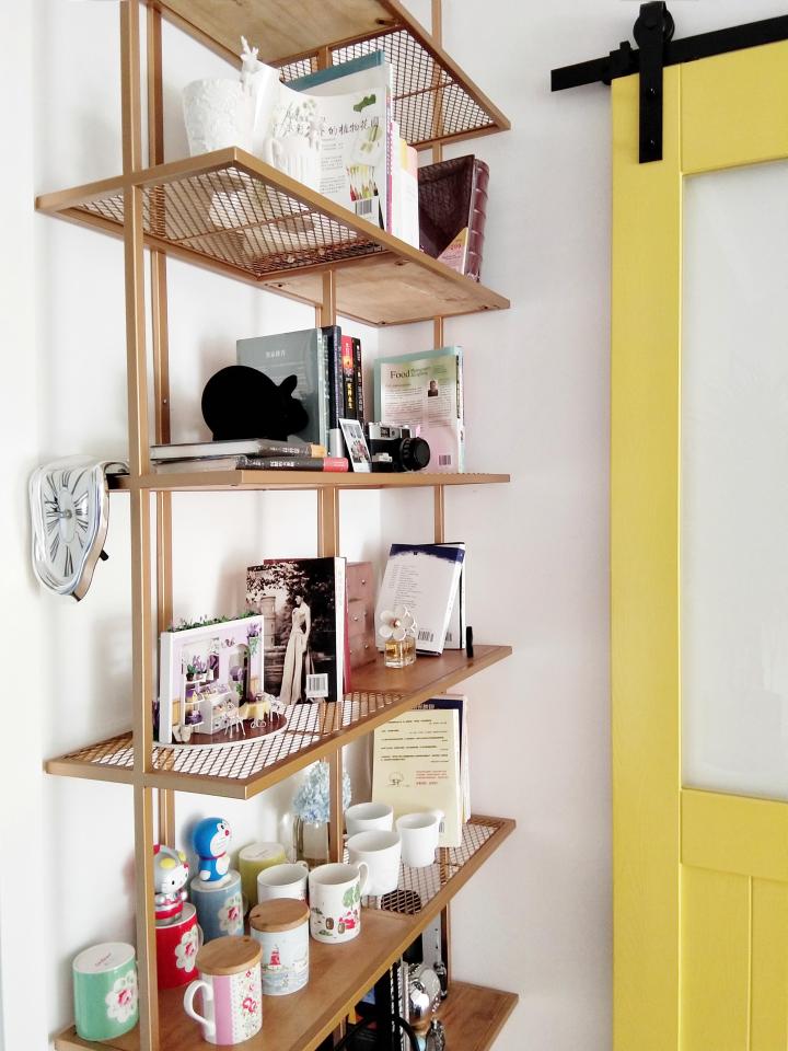 喜欢在餐桌这里看书,附近就设计了能放书的置物架。架子靠自重站立,但超过了2米高,为防止翻倒,固定在了墙上。