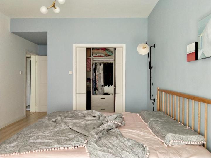 衣帽间是原先的主卫改的,用移门防灰尘,安装在内侧。衣柜的设计不甚合理,挂杆太高了拿不到,每个格子的尺寸也有问题,怪自己太相信定制柜子商家的设计水准。