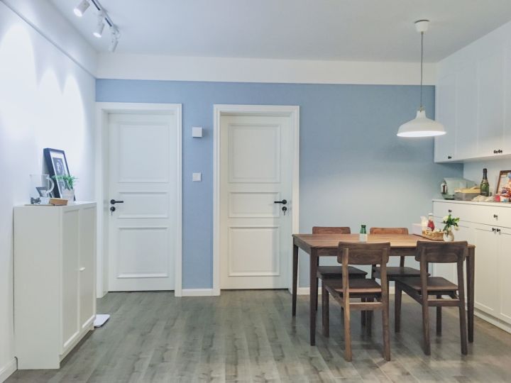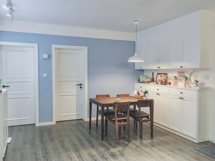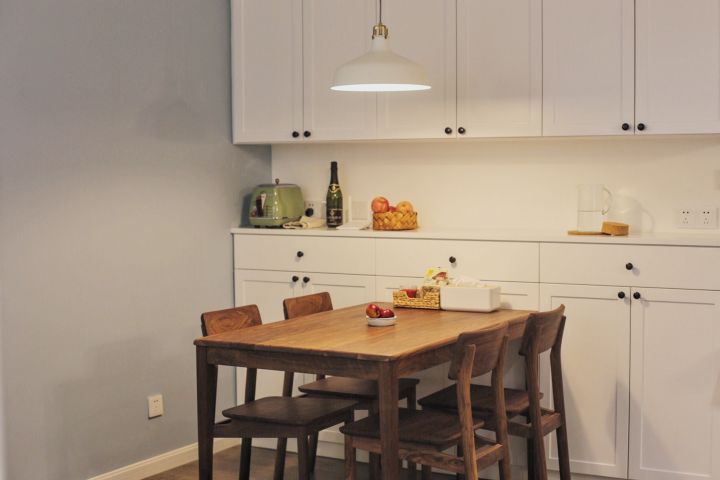 墙、门和柜子都是白色或浅色,餐桌和餐椅都用颜色较重的胡桃木,可以起到中和的作用,而且胡桃木不容易开裂变形。