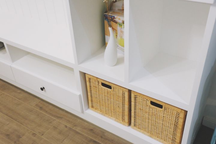 开口柜子里用收纳筐装孩子的玩具,因为小孩身高矮,只够得着下面的,收纳筐功能简单,小孩使用也没什么障碍,可以从小培养孩子自己拿自己放回去的习惯。