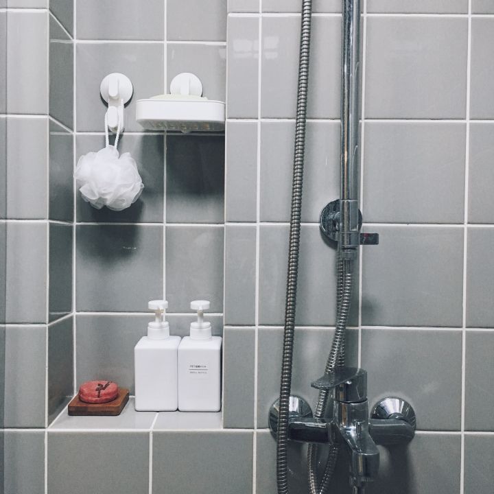 壁龛特意留出来放洗浴用品,而且还做了一点儿倾斜,这样残留的水可以自己流出来。