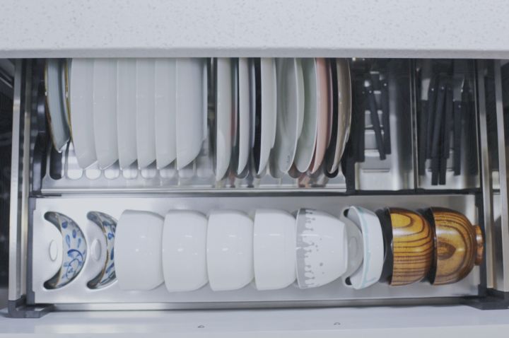 ①吊柜:高度最好控制在650~780mm之间,太高了根本不方便拿东西,也不建议做成上翻式的,上翻的柜子没办法愉快开关。这里上柜是平开式的,开关都非常方便,还放上了带把手的收纳盒。