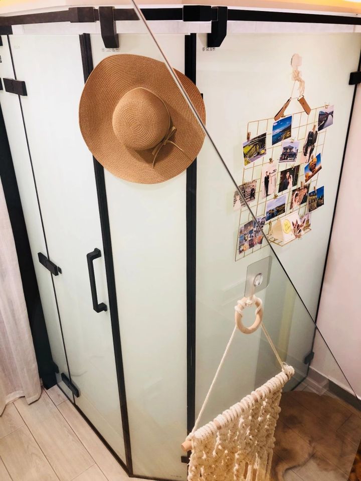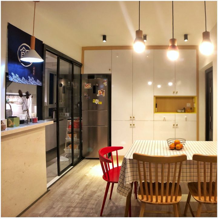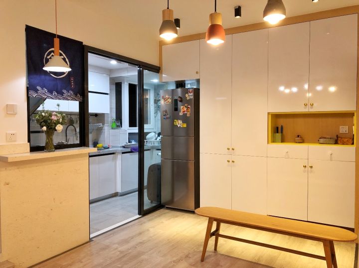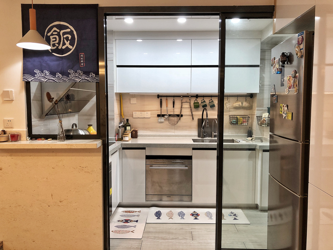 因为进门正对厨房,视线被阻挡感觉怪难受的。于是加大厨房的门洞,做了铝合金玻璃移门,边框只有4cm,整片玻璃没有分格,看着透亮。