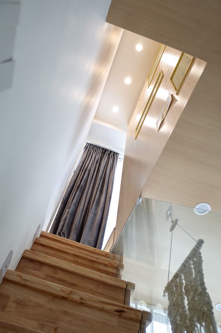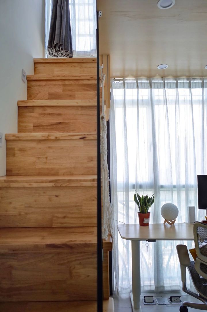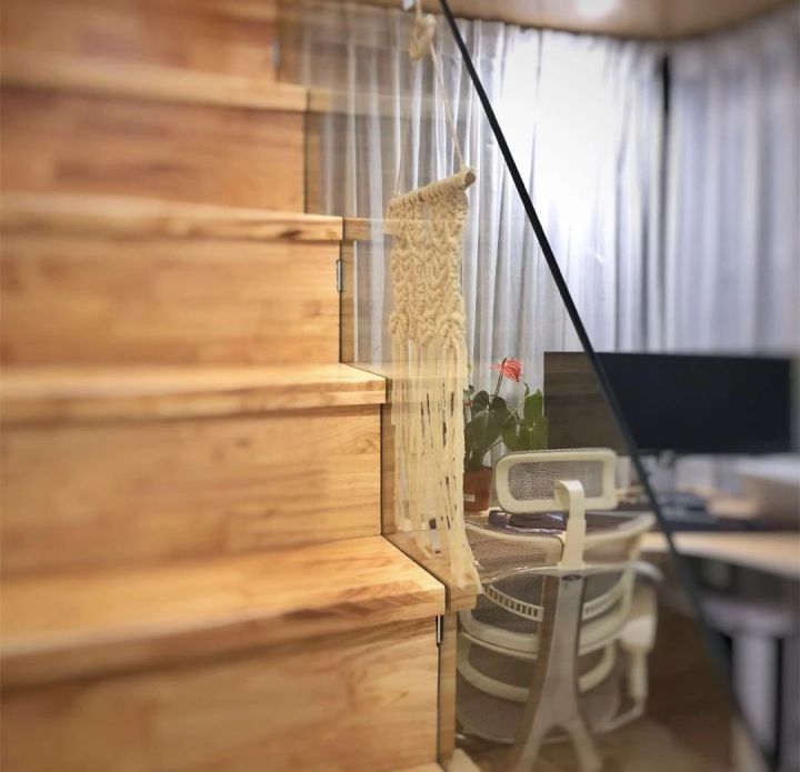 极限尺寸的小楼梯,宽64cm,算是一人能通过的最小值。台阶铺实木板,板子先预留好缝隙,安装时玻璃扶手卡在缝隙里,再用五金件固定。