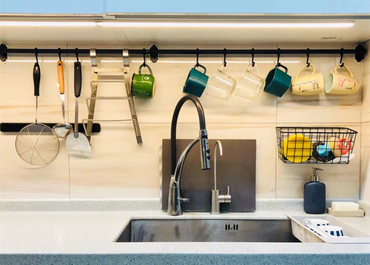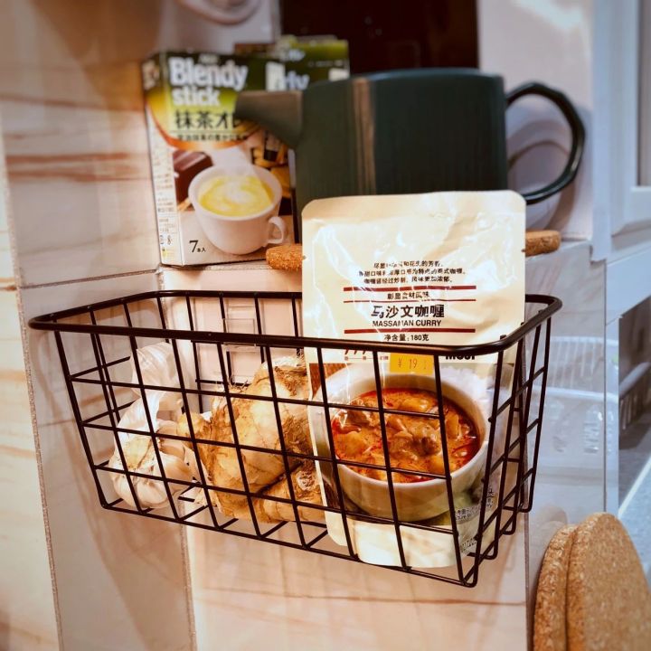 蒜和姜总不能一次用完,放在厨房窗户边不够整洁,放进挂篮里,方便拿又通风,而且粘钩+挂篮的组合特别牢固。