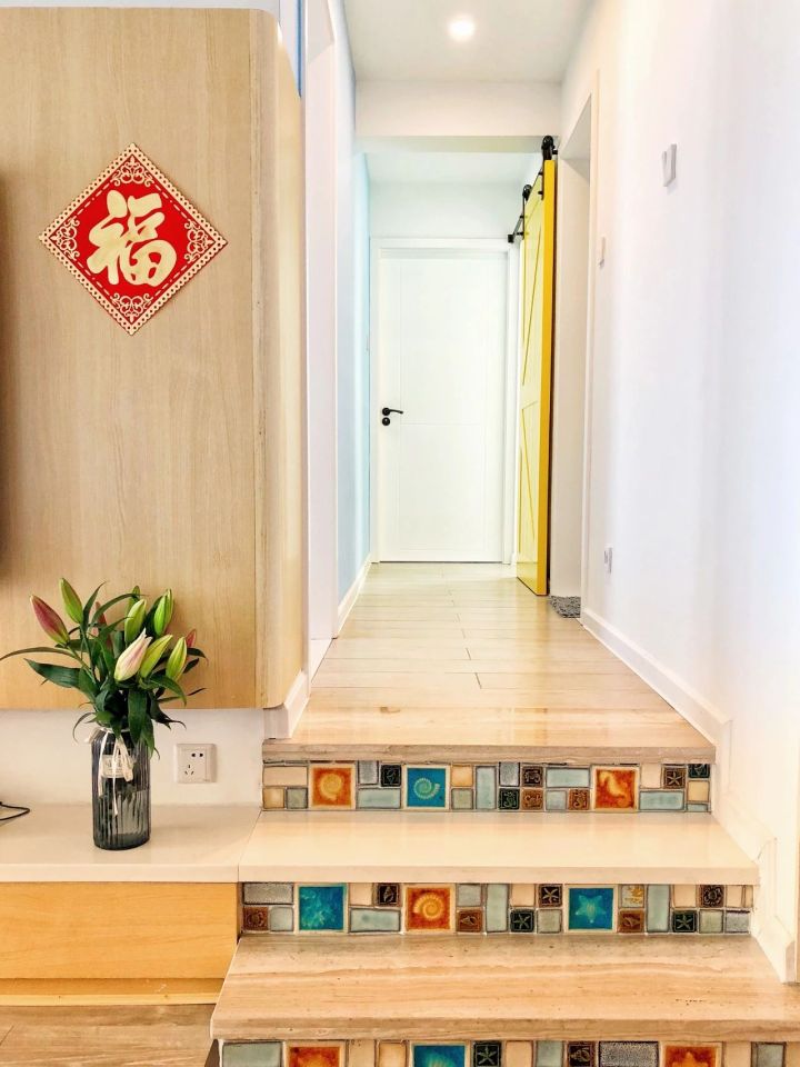 台阶踢面设计成马赛克,银色美缝,近看闪亮亮的,每小块图案都不同,特别漂亮。