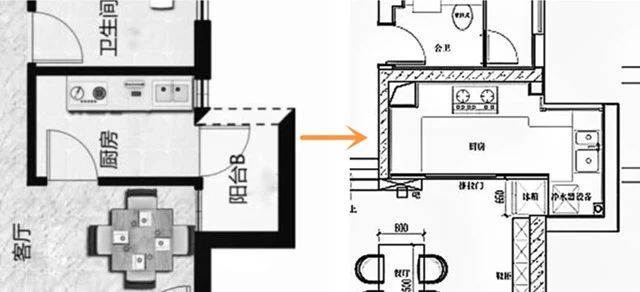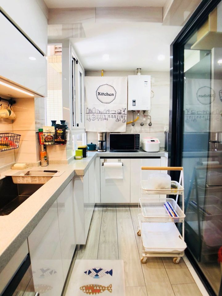 打通阳台,厨房从只有一排橱柜的“过道式房间”,变成有7平米的完整大厨房。