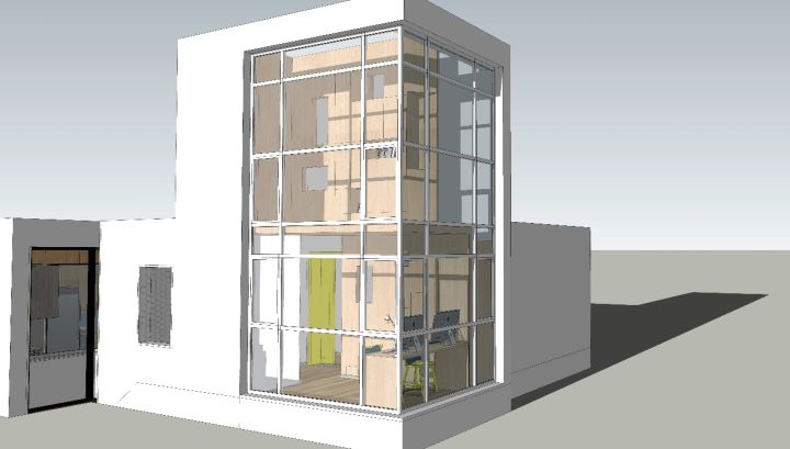 露台有遮雨顶棚,本着空间利用最大化的原则,加落地玻璃封成室内空间,成为上下两层的迷你LOFT,功能是书房办公和会客休闲。