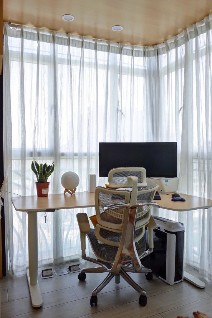 先生手抚心心念念的升降桌,面朝大窗,春暖花……还是拉上纱帘遮遮太阳吧。