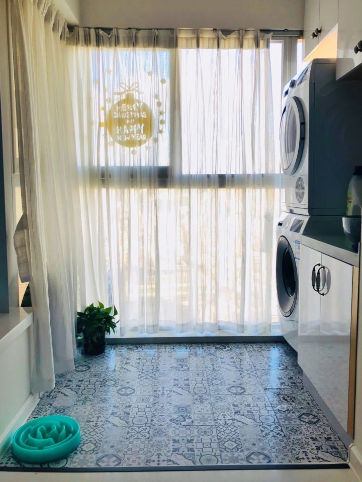 紧邻飘窗是阳台,虽然不宽,但足足有1.75米深,做个家务区绰绰有余。洗衣机和烘干机叠放,不是直接摞起来,用品牌专配的支架,防压、防晃。
