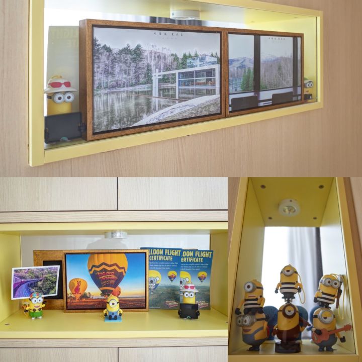 LOFT也是家里的收纳主力区,比如一层楼梯下面是储物柜,二层是顶天立地的双面收纳柜,面向楼梯这面挖了几个橱窗,加了小射灯,展示霈梵热爱的小黄人们。