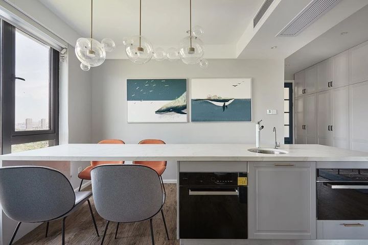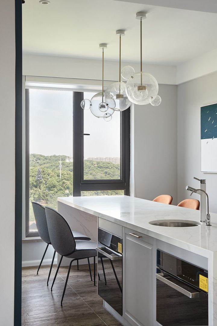 厨房因为有承重墙,做不了我心心念念的开放式厨房加中岛,只好把餐厅的餐桌部分改成中岛加餐桌,增加了台面,烤箱蒸箱也安排在了餐厅,算是中西厨分开了。