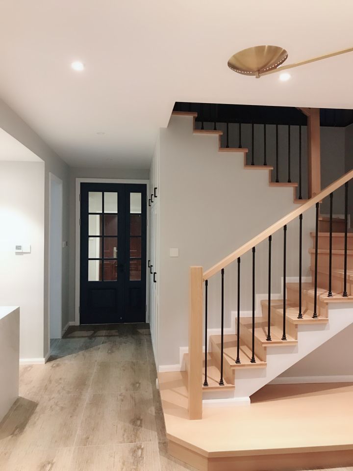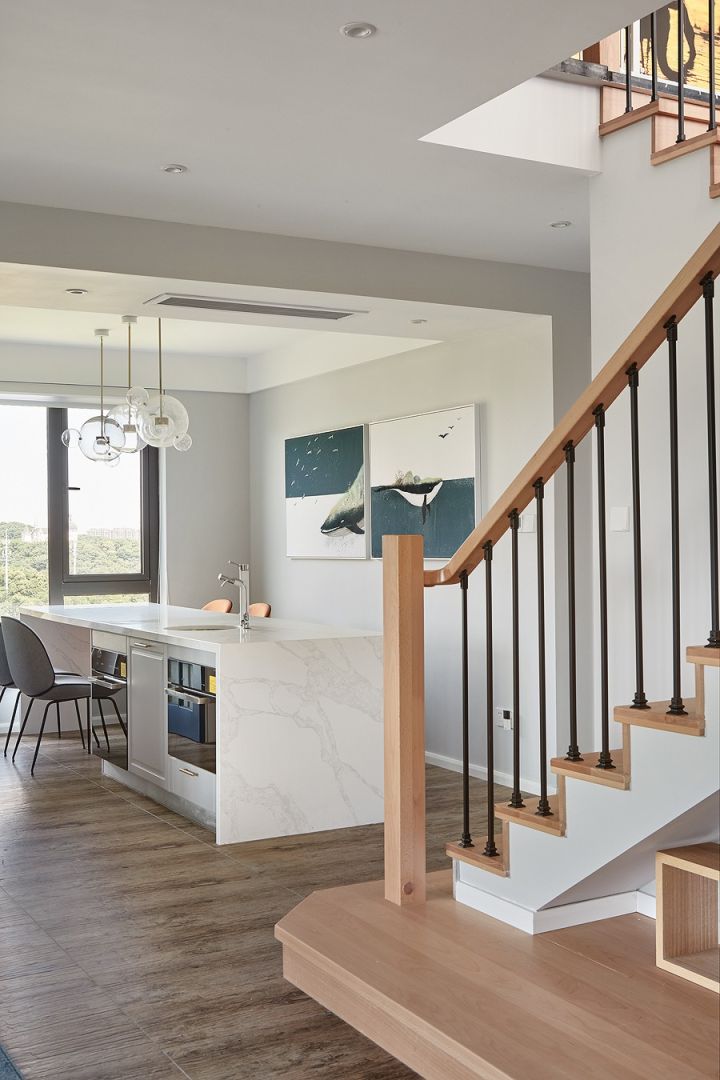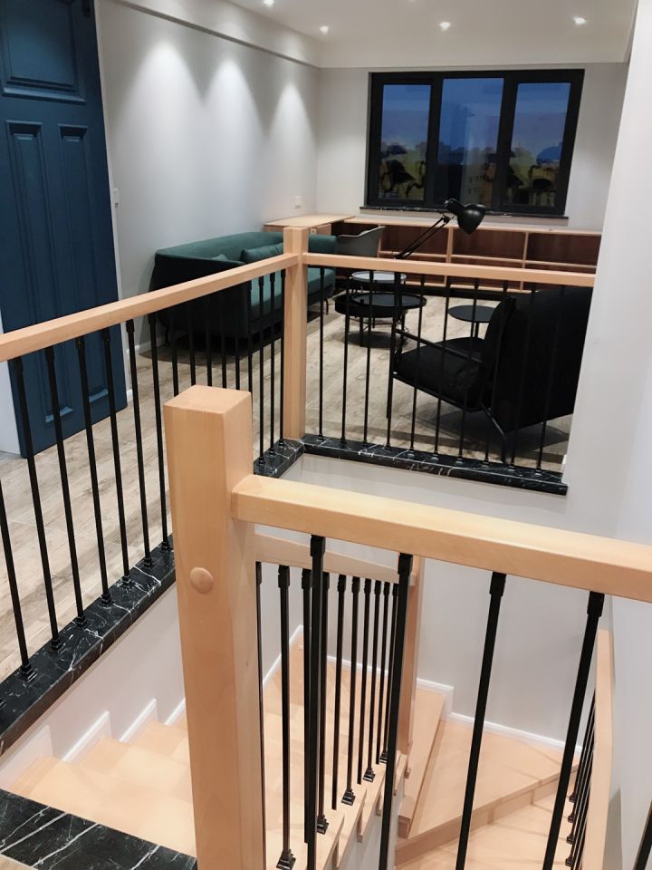 楼梯是钢架搭的,当时一心想找这种细栏杆楼梯,全套做下来很满意,细细的栏杆很显气质。