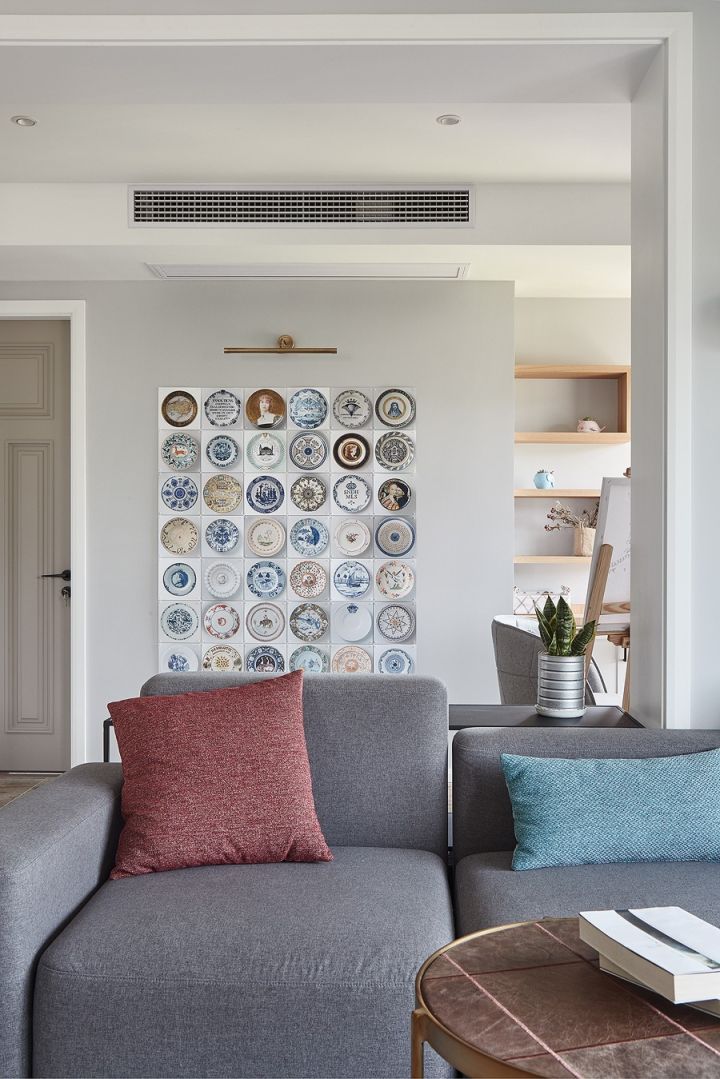 沙发背景墙上做了一幅画,ixxi的陶瓷盘系列,很漂亮,这种产品有自己特殊的拼装方式,操作起来也很容易。
