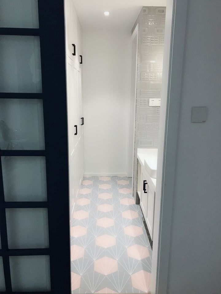 全屋除了两个卧室是地板,其余都是瓷砖,客厅用的方形木纹砖效果也不错,不一定非要仿地板的样子用长条形的。