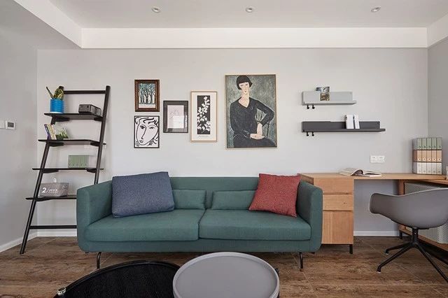 ▲能看到沙发背后的开放式书房区域