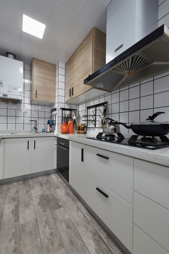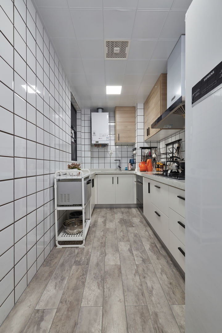 橱柜怕全白色觉得单调,吊柜做的木色,出来的效果不错。
