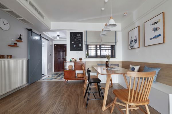 卡座是餐厅最得意的设计,很实用,下面放点杂物和零食非常方便。原木餐桌来自网购,加上两把温莎椅,一共2k+,实惠好用。