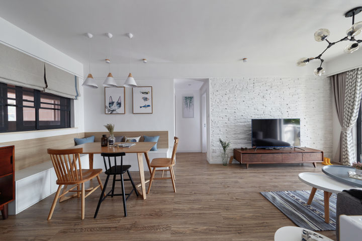 餐桌对面的小片墙壁采用灰色系,满足男主人对冷色调的偏爱,也是在全屋的纯白和原木色中做个点缀。