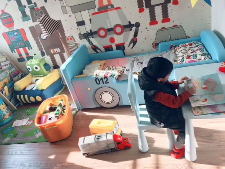 儿子在上幼儿园,需要宽敞的空间玩玩具和做游戏,所以没有用常规1.5米的床来占满整个房间,而是选择一个他目前够用的床,把中间的区域腾出来活动。