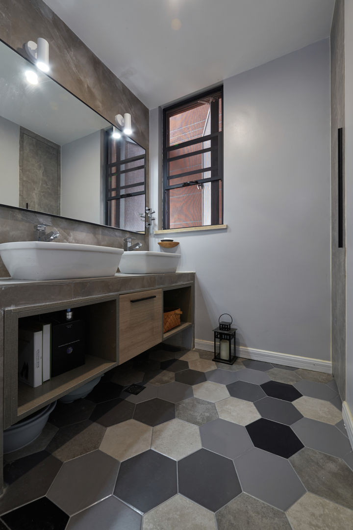 最后是卫生间。因为家里常住就是三口人,没必要搞两个很小的卫生间,把原本的主卫和次卫合二为一,变成一个大卫生间,实现干湿分离,干区还做了双面盆,能满足早上一家三口同时洗漱的要求。