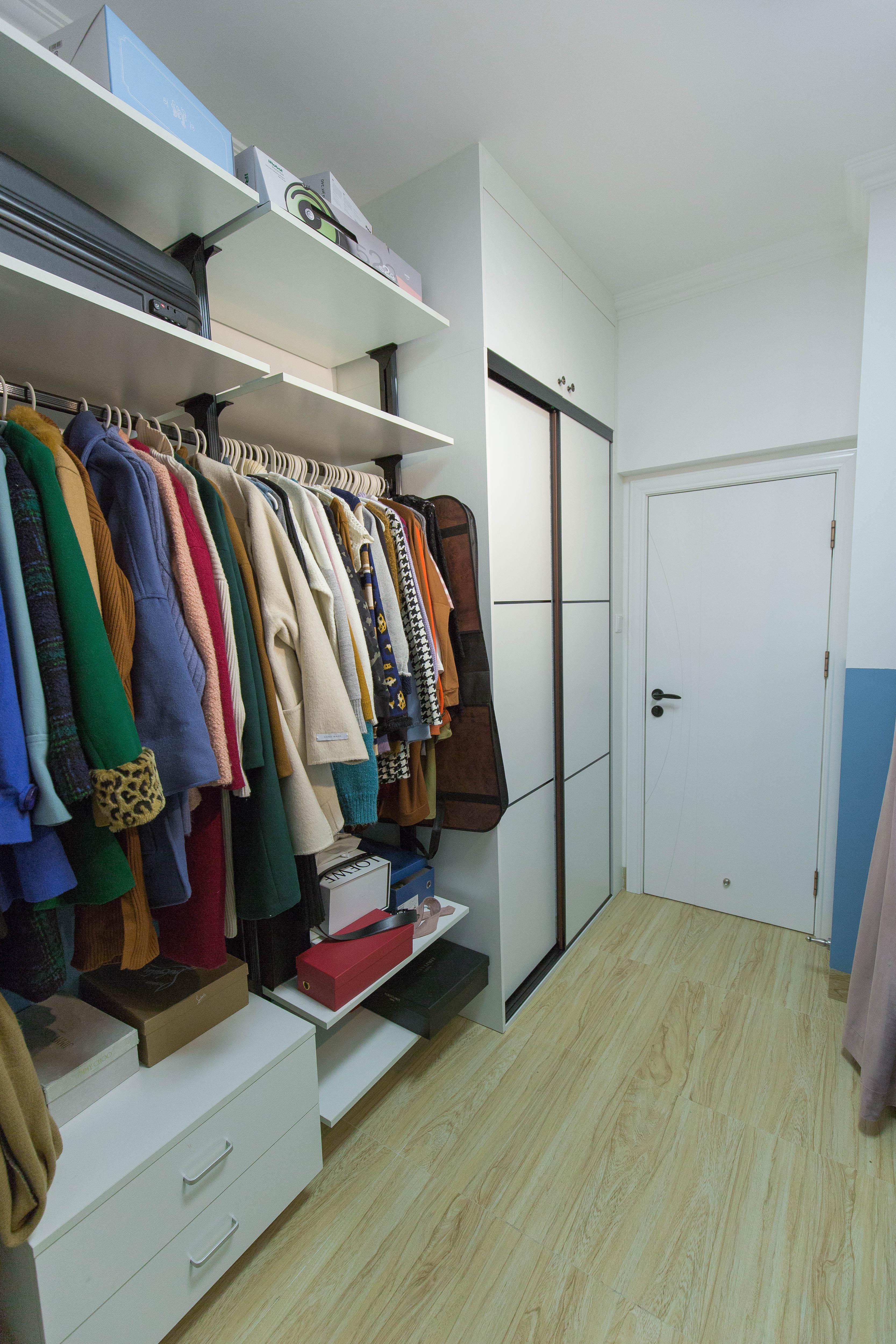 因为未来要改成儿童房,所以只做了很少的固定衣柜,另加开放式衣架补足收纳。