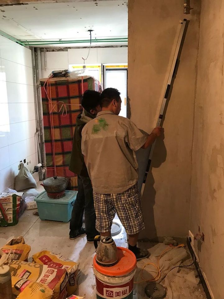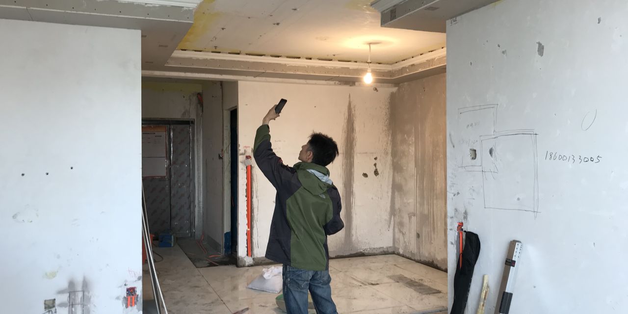 杨监理一边测量,一边拍照。根据行业标准,墙面水平度误差不得超过3毫米。碰到误差比较大的地方,他就会马上标记下来,并告诉工人这儿需要填补一下。一圈下来,这套50平左右的房子被标记的地方共有四、五处。