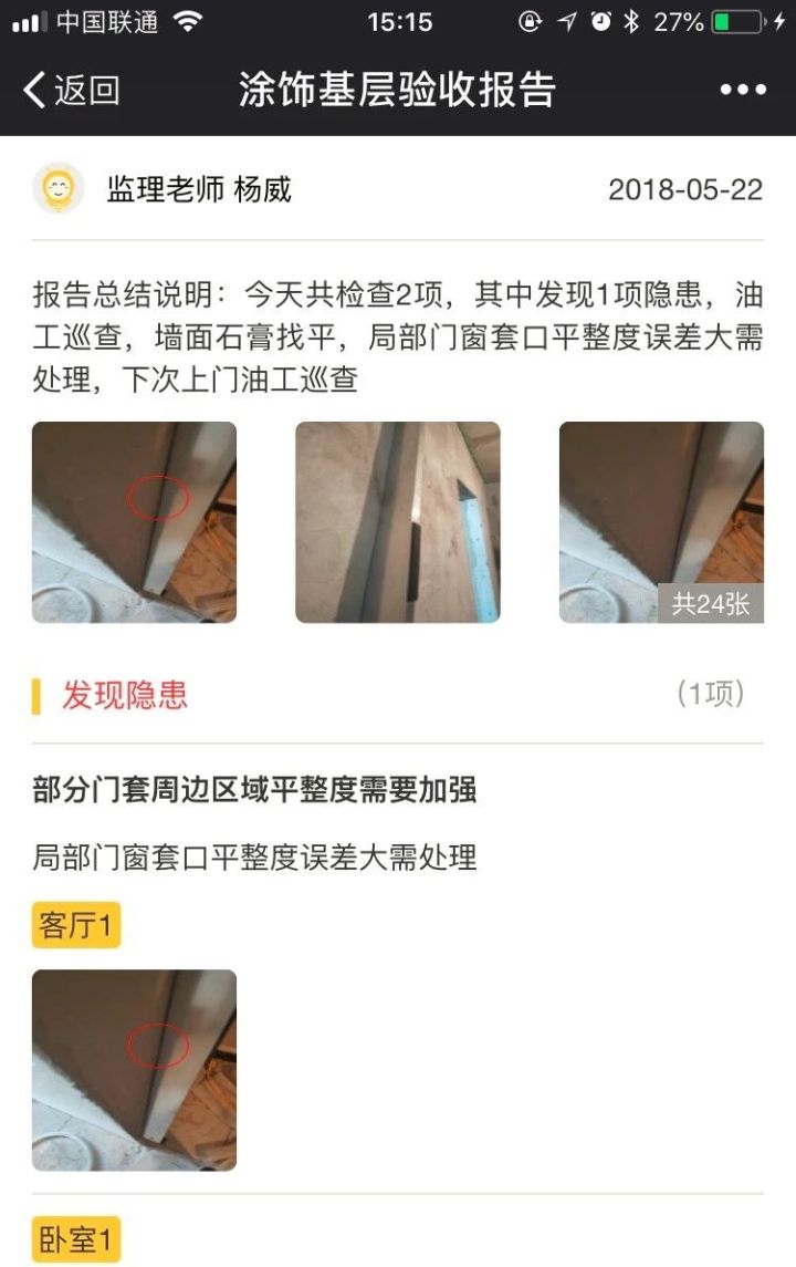 1次油工巡查:检查墙面平整度,将不符合要求的墙面标注出来;局部门窗套口平整度误差较大,告知工人整改,并会在下次复查。指出一户瓷砖使用的粘接剂过厚,容易出现开裂、空鼓的情况,建议整改。