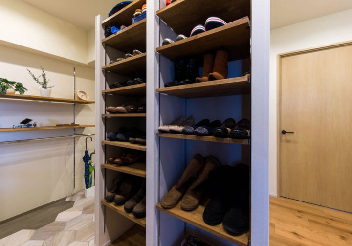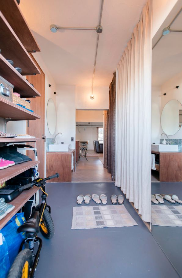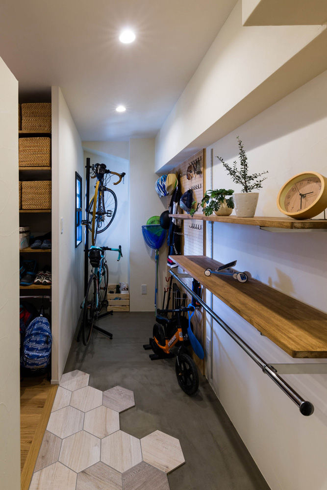L夫妇热爱骑行,所以玄关用架子挂置了自行车。玄关狭窄,不宜做成带柜门的厚柜子,用开放架能节省空间。