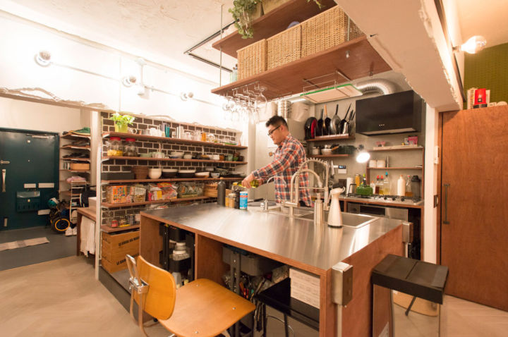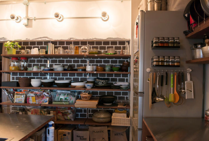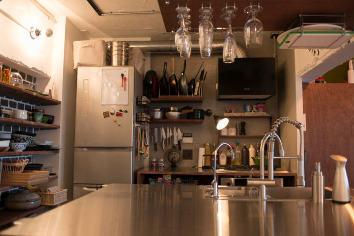 这个开放式厨房的空间很紧凑,但收纳充分,功能多样。取代吊柜的是S先生特意选择的货架,摆放酒杯器皿和生活用品。