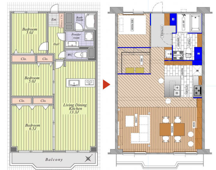 C夫妇居住的房子已有40年的历史,面积约为60平米,这次翻新,一方面为了孩子,另一方面也是为了居住得更舒服。