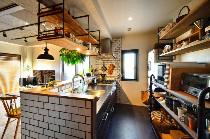 开关门很麻烦,所以收纳尽可能使用开放式。木质和不锈钢材质一结合,看上去就不那么冰冷了。