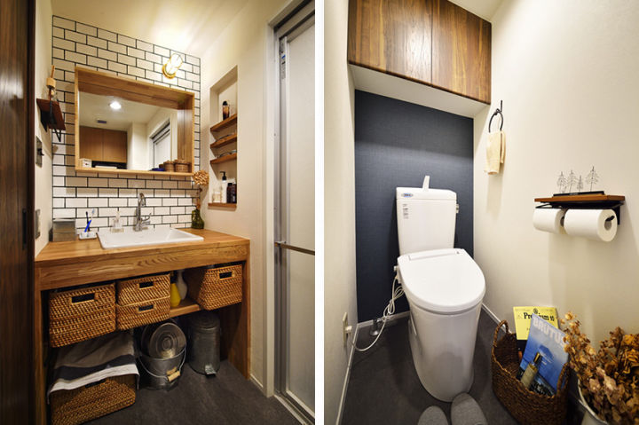 原木洗手台散发着质朴的气息,墙壁上的壁龛方便收纳,洗手台的下方也留有收纳空间。如厕区的布置也很用心,收纳篮、干花、书籍、小装饰,不多不少刚刚好。