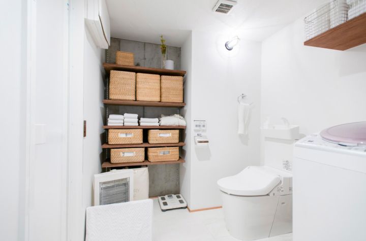 卫生间内统一为白色,没有窗的空间也给人简单干净的印象。墙壁上的置物架和玄关处的异曲同工,方便储存毛巾类物品。