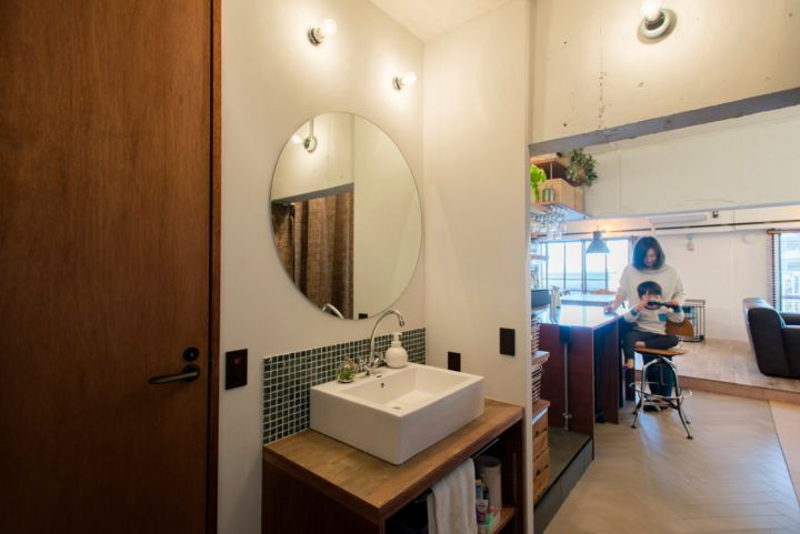 洗手台设在从入口到客厅的走廊角落,让孩子养成回家洗手的习惯。台子的高度尺寸也是根据孩子量身定制。