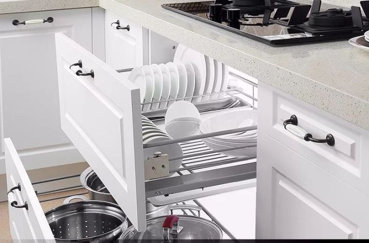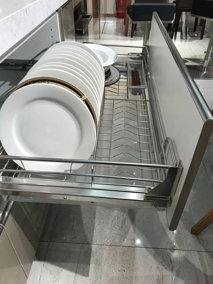 几乎每家橱柜都会配至少一个拉篮,因为锅碗瓢盆、烤箱、微波炉、各种调味品,导致台面混乱不堪,让本来就不大的厨房更显逼仄。拉篮正是为解决此难题而生。