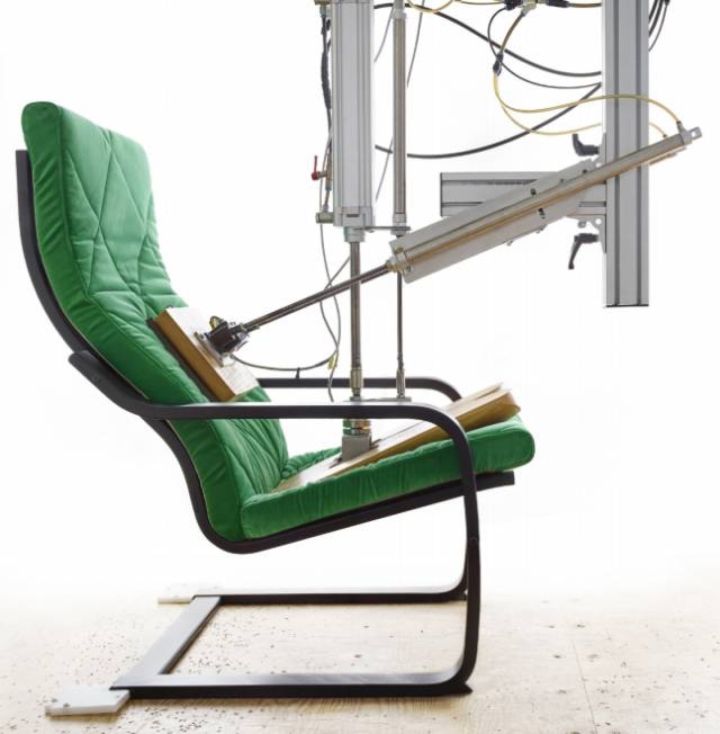 在波昂扶手椅刚问世的几年里,宜家就在卖场中配置了一台机器进行压力测试,每分钟20次,可达1000N的压力进行50000次压力试验。
