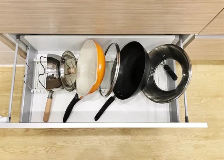 橱柜里面,能做成抽屉就不要做隔层。隔层需要弯下腰探头朝里面看,而抽屉拉出来,想找什么,一目了然。