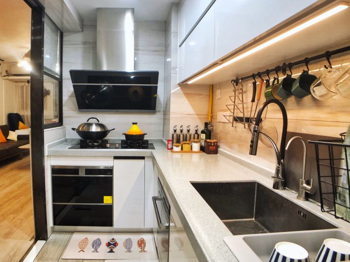 厨房顶灯通常在天花板中部,而人在厨房操作时背对顶灯的,身体和吊柜会打下一片阴影。在吊柜底下加一条灯带,照亮操作区,菜色也变得鲜艳诱人,做饭的心情大好。