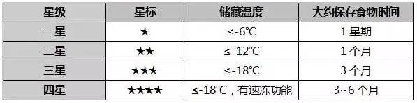 冷冻能力还有一个星级指标,每颗星代表6℃的制冷量,星级越高制冷性能越好:一星级冰箱能达到-6℃;二星级冰箱能达到-12℃;三星级冰箱能达到-18℃;四星级冰箱能达到-18℃以下。