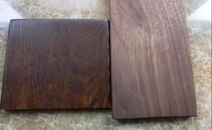 真的黑胡桃纹理自然像小桥流水,很温和,假的纹理则气场咋咋呼呼。再看纹路中的色差,真的黑胡桃纹路中间相比其他地方只稍微深一点,而假的每到纹路处明显变深变黑。