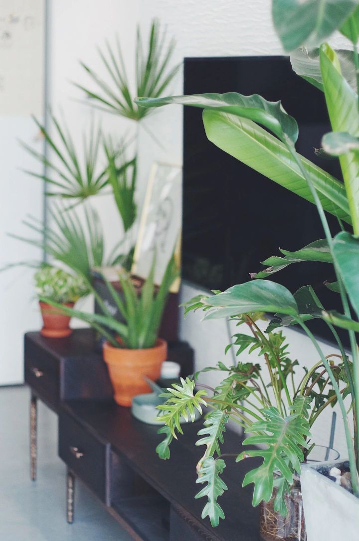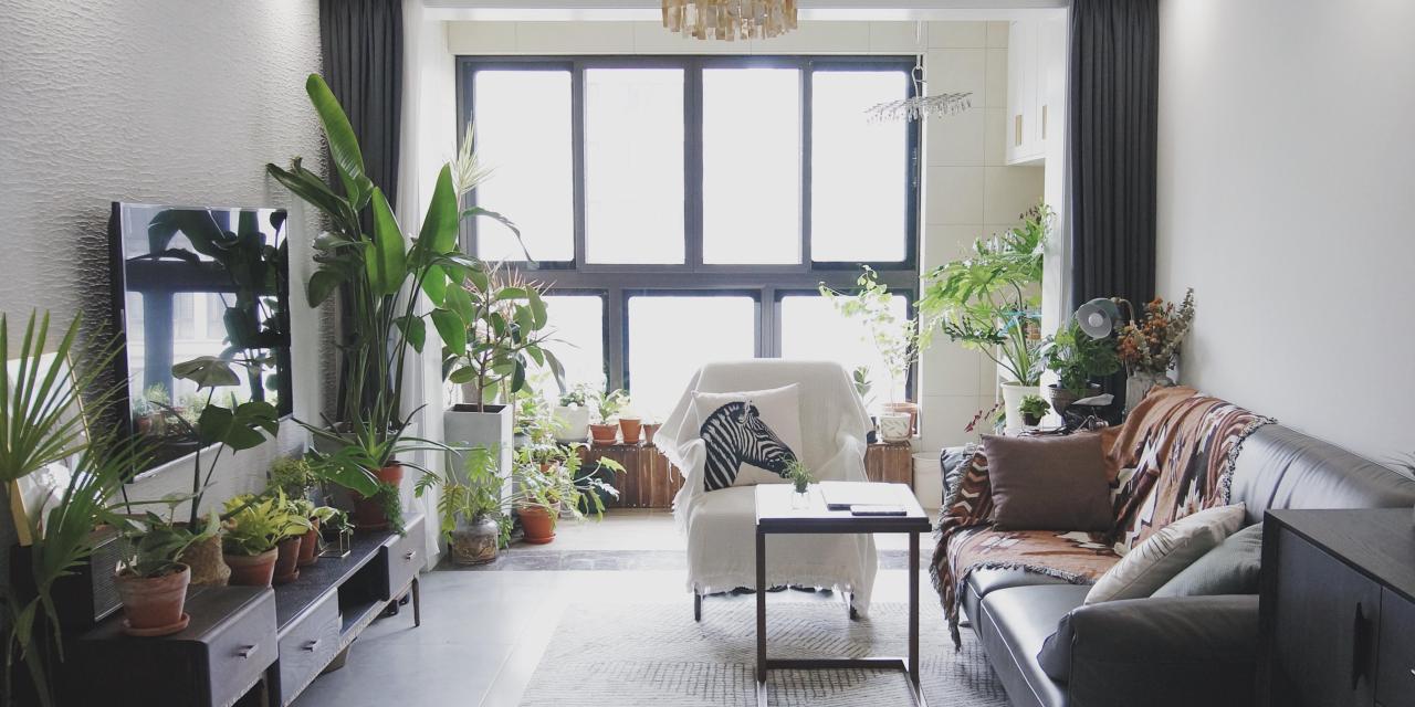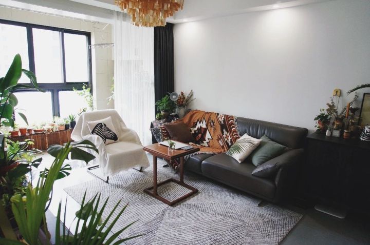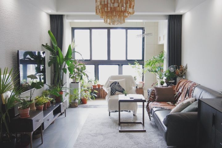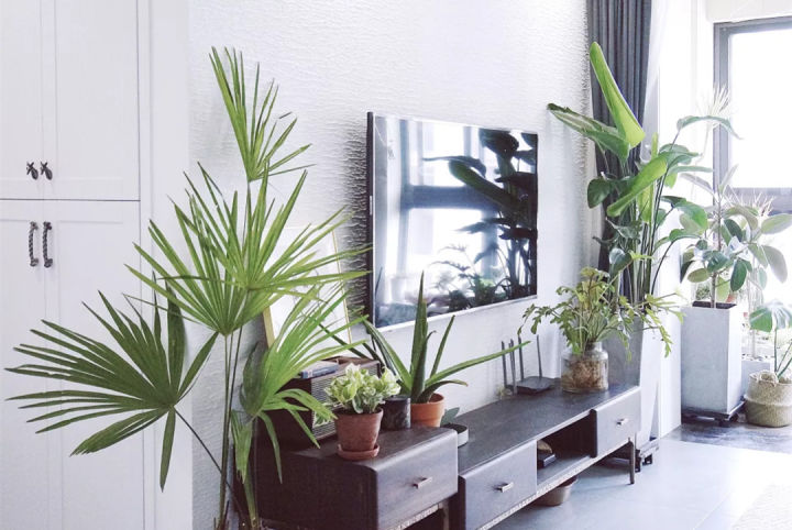 电视柜长度不够,加个小矮柜。上面任意摆几盆植物,顿时元气满满。