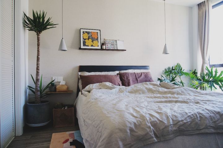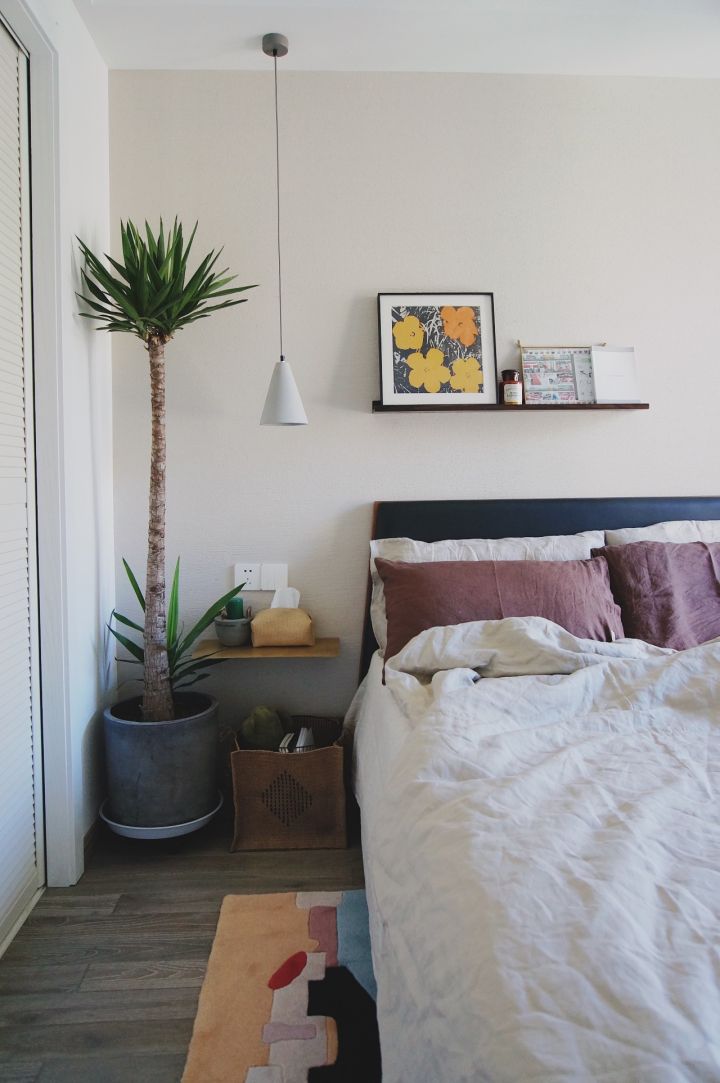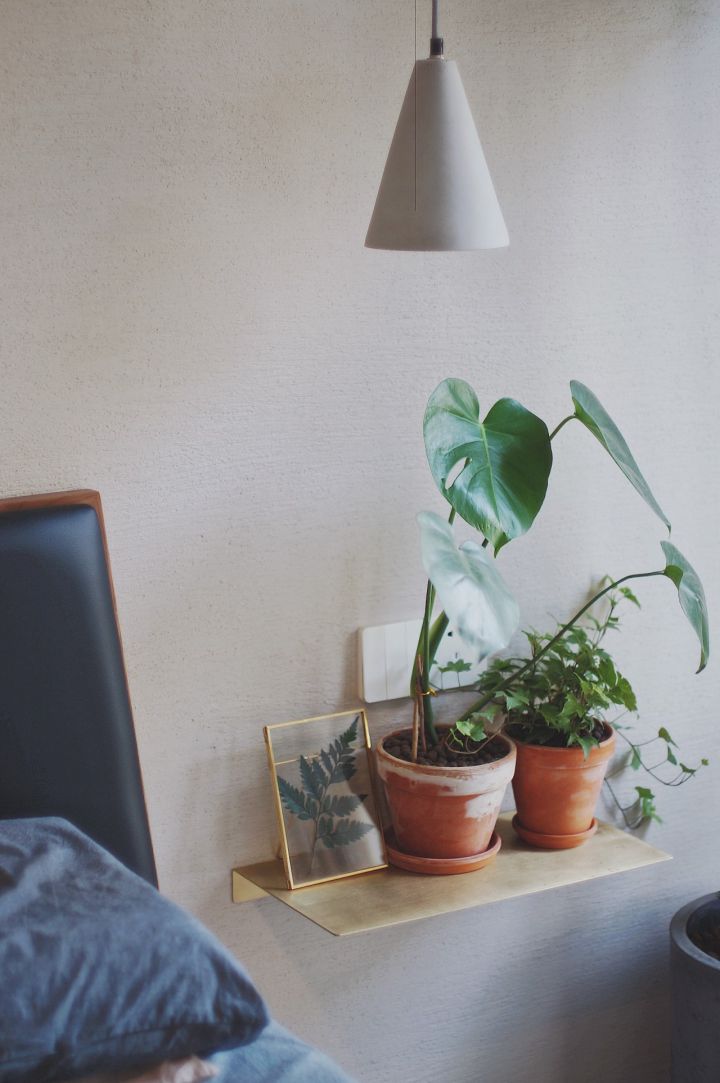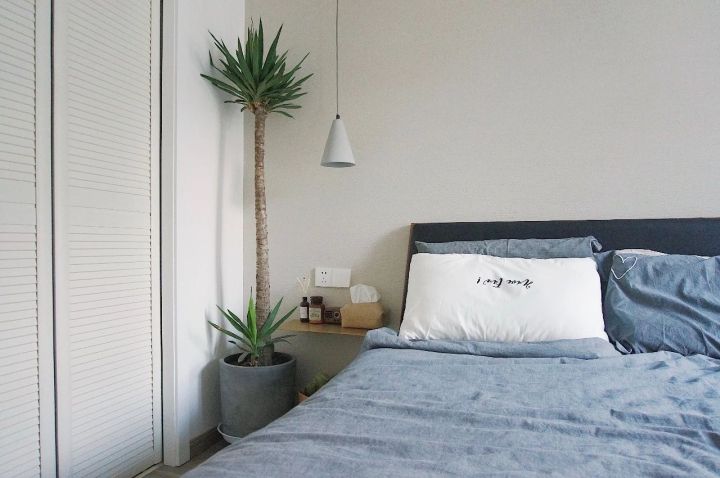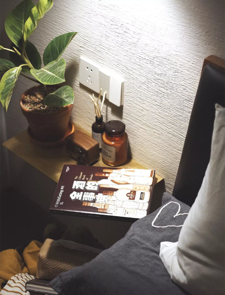 觉得床头柜除去表面放放杂物就没什么用处了,所以不要床头柜,而是床两边各钉了一片搁板。靠窗的搁板放几盆小植物,晒着太阳,生长状态很好。
